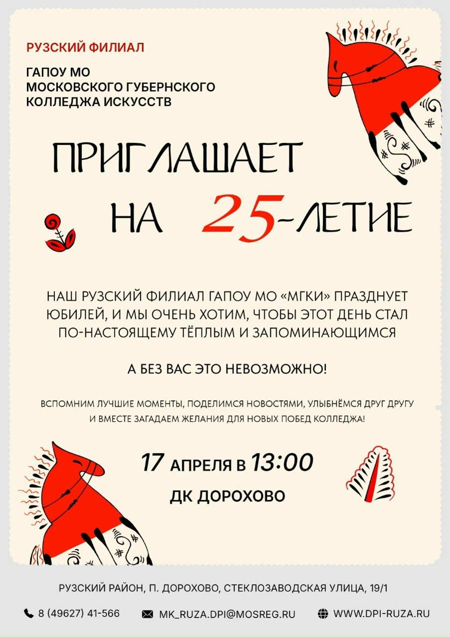 Мы с радостью сообщаем, что Рузский филиал ГАПОУ МО «МГКИ» отмечает знаменательную дату —! Мы гордимся нашими студентами, выпускниками и преподавателями — теми, кто внёс и продолжает вносить вклад в развитие колледжа и культурной жизни региона!